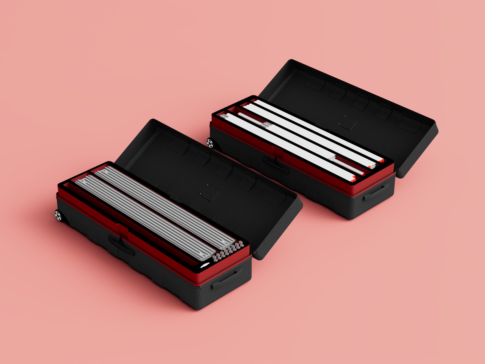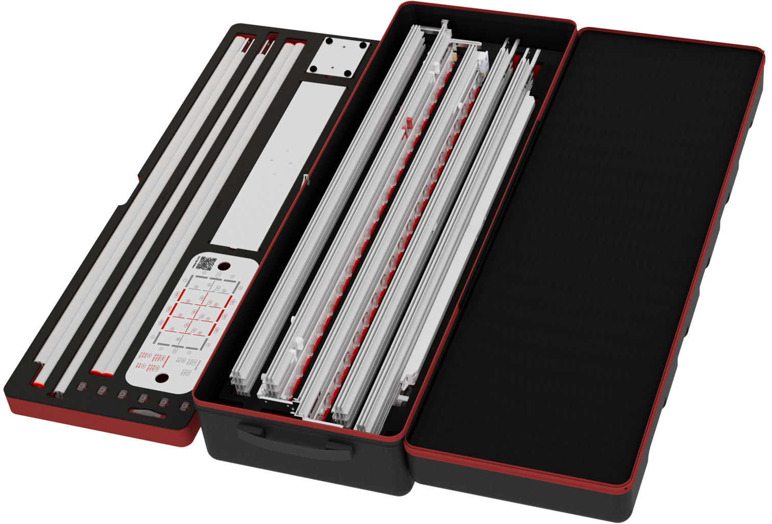 BIGUP wird in einem handlichen ABS-Hartschalenkoffer mit nur 1,2 Metern Länge verpackt, wodurch es leicht in jedem PKW oder zusammen mit anderen Systemen auf einer kostengünstigen Europalette transportiert werden kann. Jedes Teil ist einzigartig nummeriert, was es einfach macht, seinen Platz im Hartschalenkoffer zu finden. Für zusätzlichen Schutz ist der Koffer mit Schaumstoffeinsätzen ausgestattet. Mit einem Gewicht von nur 32 kg ist BIGUP leicht und einfach mit den Rollen und Griffen des Koffers zu transportieren.