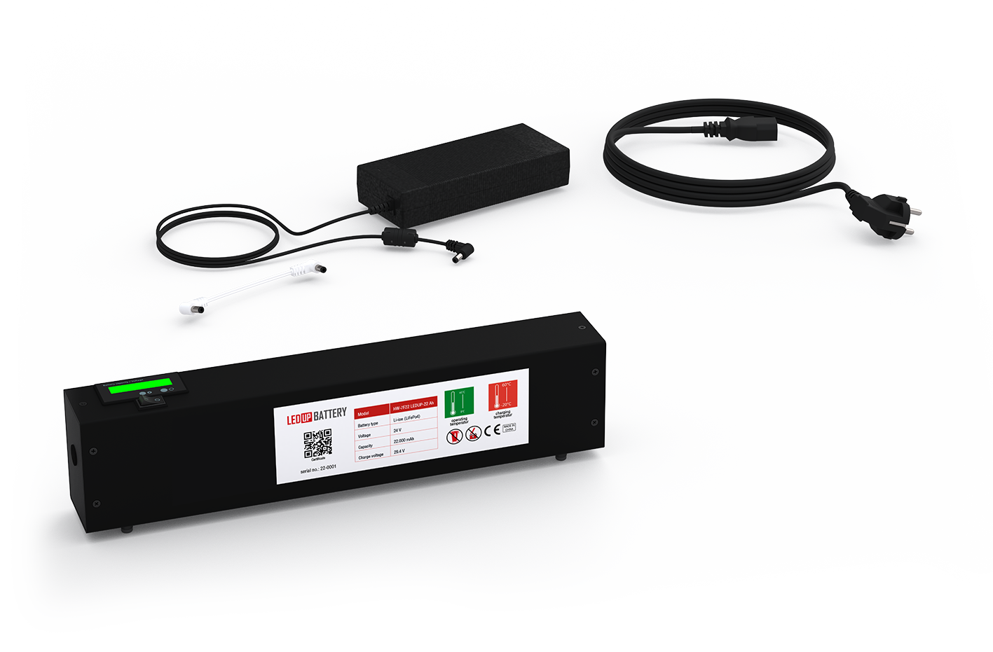 Der wiederaufladbare 24 Volt Lithium-Ionen-Akku hat ein Gewicht von 2,8 kg bei einer Leistung von 11.000mAh und kann z.B. den Counter MAX ca. 9 Stunden lang beleuchten. Damit haben Sie die Möglichkeit, einen Counter, einen ganzen Messetag lang zu beleuchten.