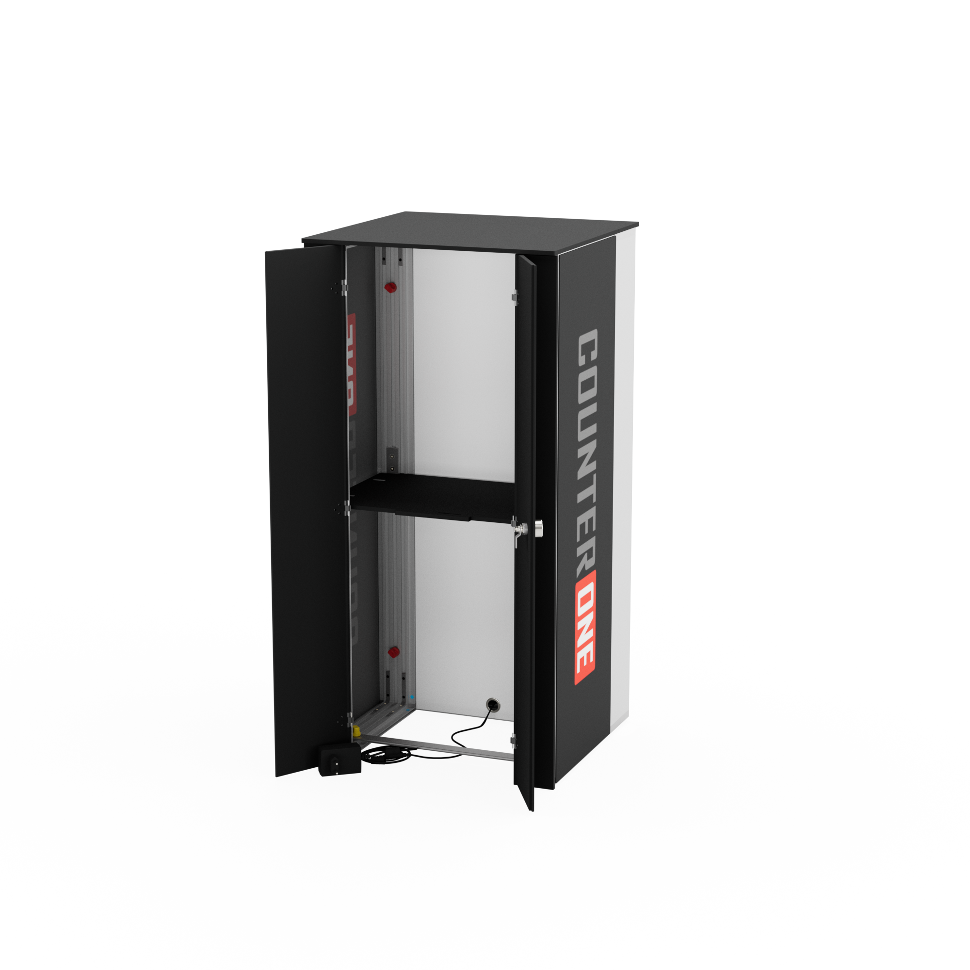 Counter One Mini ist überraschend leicht (23 kg bzw. 28 kg mit Tür) und daher einfach zu transportieren. Er wird in einem robusten ABS-Transportkoffer (119 x 41 x 21cm) geliefert, mit spezieller Schaumstoffauskleidung, Rollen und einem Griff.