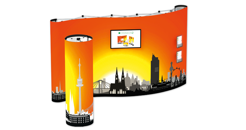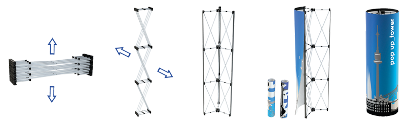 Die faltbare Säule Pop Up Tower ist einfach aufzubauen. Entfalten Sie das System – magnetisches Schließen, montieren Sie die Magnetstangen und fügen Sie die Paneele hinzu.